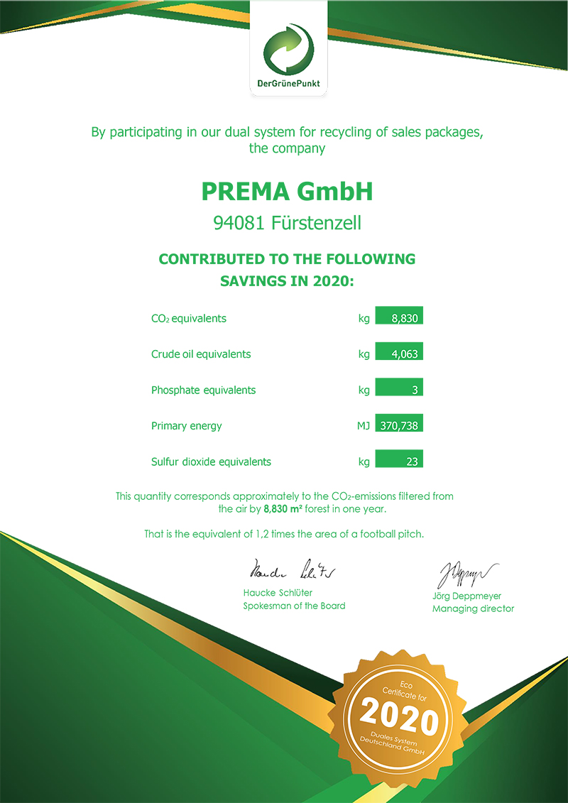 Active participation in climate and environmental protection is an important concern for PREMA. For us, recycling sales packaging is an expression of sustainable business. It serves to save energy, resources and emissions. We therefore decided to participate in the Dual System for the recycling of sales packaging as part of the “Grüner Punkt” (Green Dot) initiative and have now been awarded the initiative's environmental certificate for our 2020 commitment.
